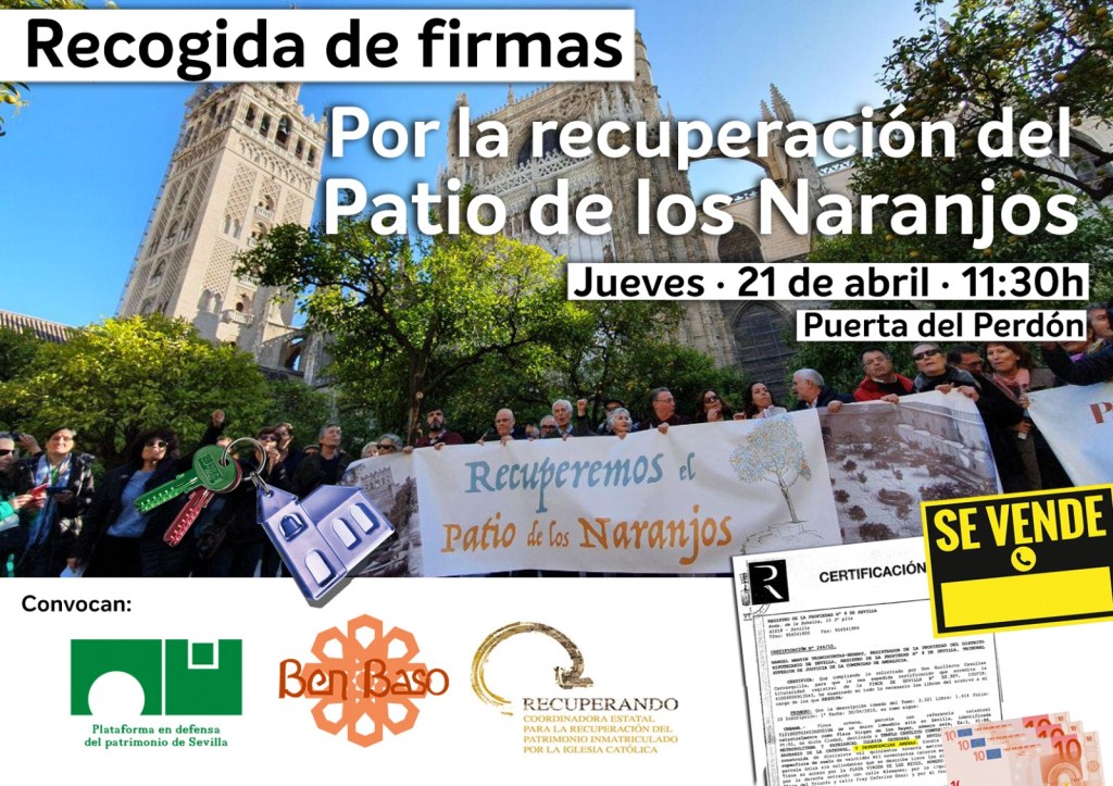La Plataforma en Defensa del Patrimonio de Sevilla, la Asociación de Profesores para la Difusión y Protección del Patrimonio «Ben Baso» y la Coordinadora Estatal “Recuperando” han organizado una campaña por la recuperación del Patio de los Naranjos cuya primera convocatoria será el próximo jueves 21 de abril a las 11’30 horas en la Puerta del Perdón en la calle Alemanes.